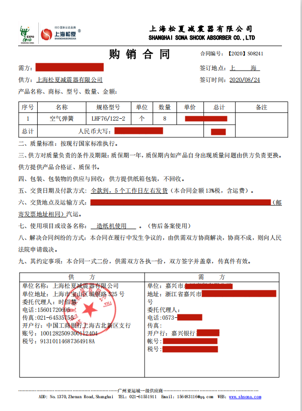 【造紙機配套】上海松夏空氣彈簧合同介紹: